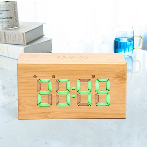 Real Bamboe Hout Led Light Wekker Draadloze Opladen Draagbare Digitale Home Office Slaapkamer Reizen Houten Bureau Klok