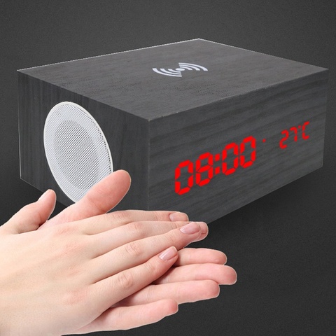 Hout Wekker Bt Speaker Qi Draadloze Opladen Desktop Reloj Wol Despertador Temperatuur Led Licht Display Orador