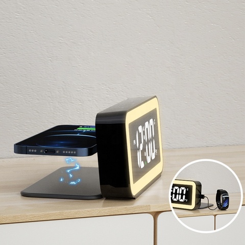 2024 Novo Design Multi função Time Display 4 em 1 Despertador Digital 15W carregador sem fio rápido com luz conduzida da noite